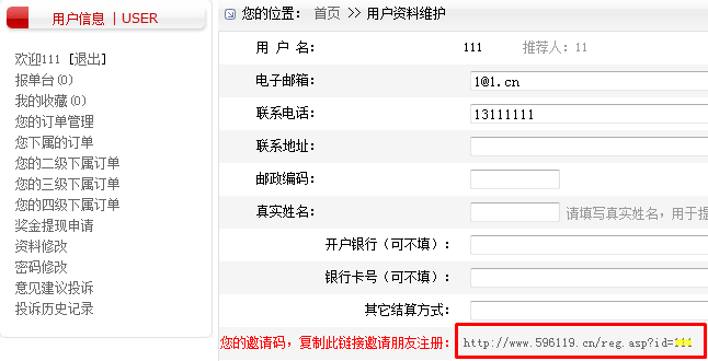 6.复制并发送下图红线框中的链接给朋友完成注册,朋友从此链接进入本站注册,邀请码系统自动填写: